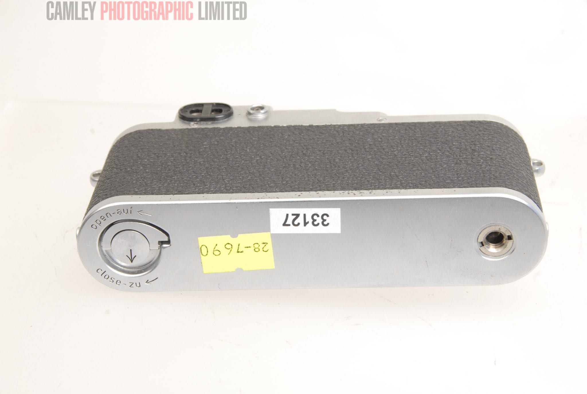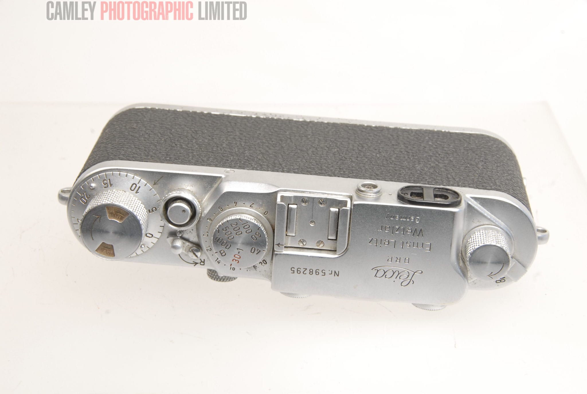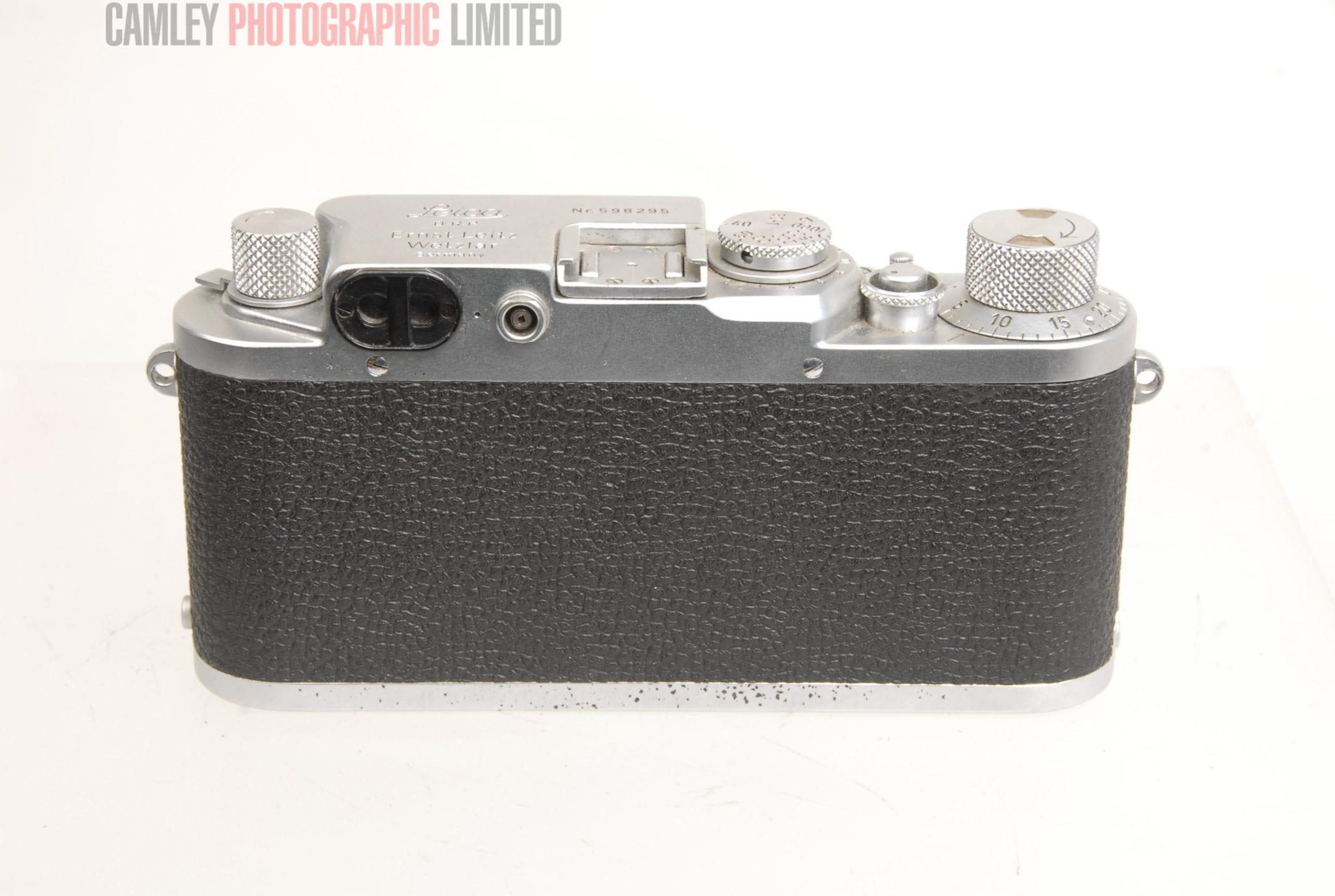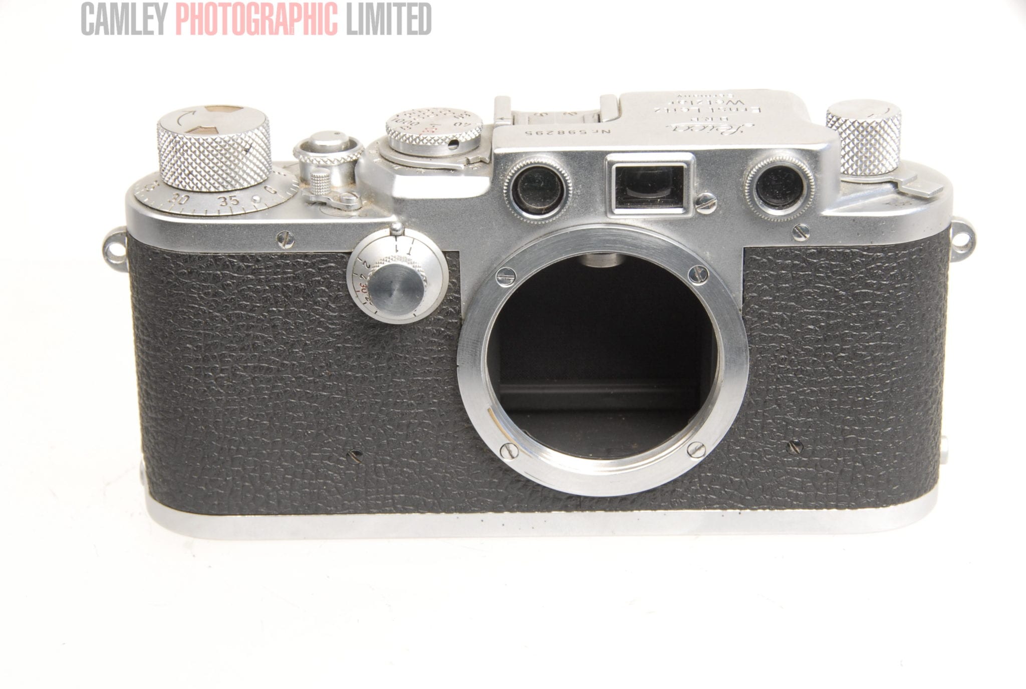 Leica IIIf body. Serial number 598295. This camera has a slow shutter and needs the blinds replaced.