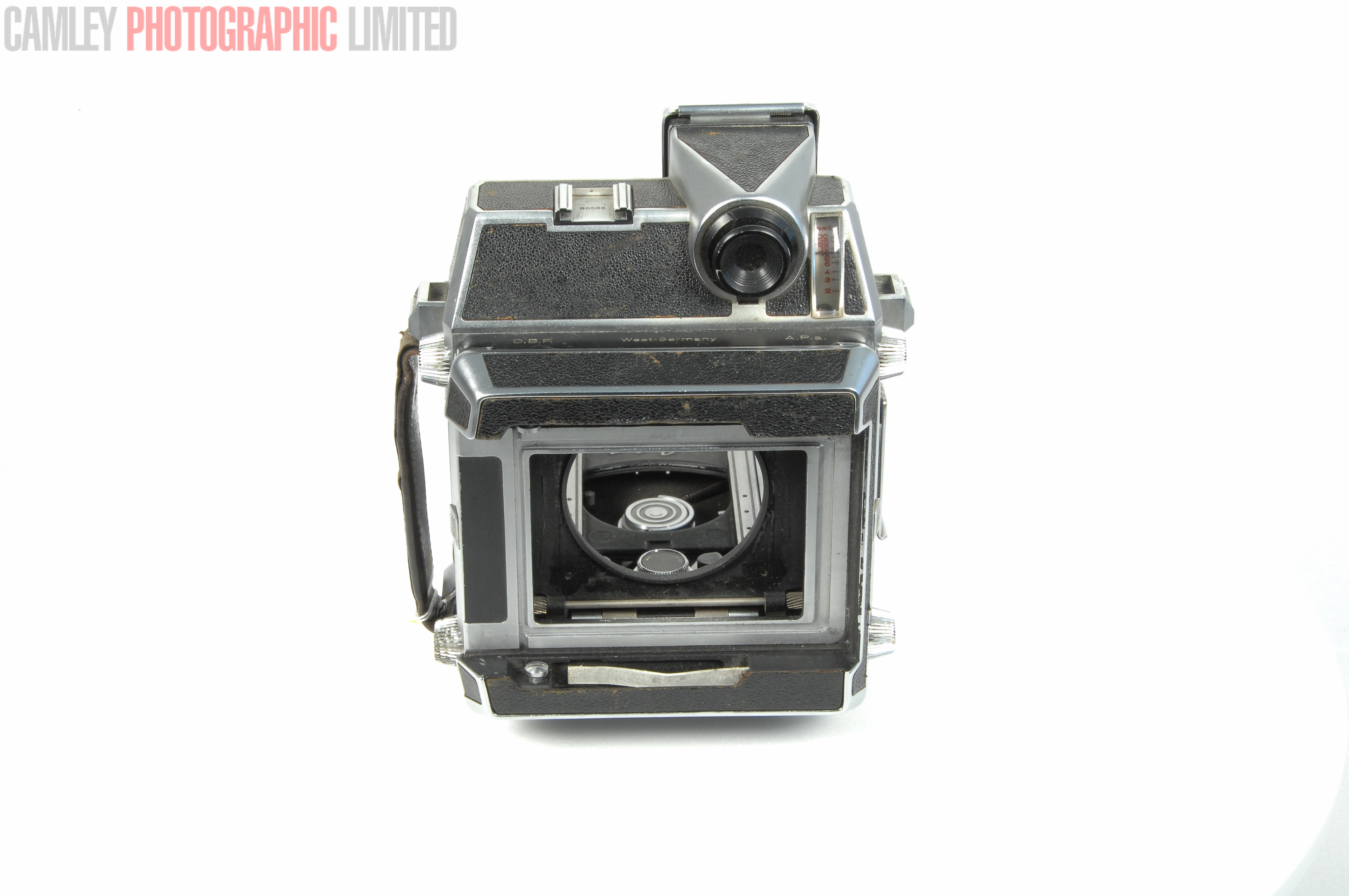 An incomplete camera. Working and undamaged, just incomplete. Missing the viewing scree, bellows, rangefinder cam and back clips.